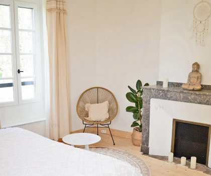 Zimmer (25m²) im Bohème-Chic-Stil und dekorativem Kamin mit einem schönen Badezimmer, Dusche und Badewanne (Bio-Seife), zwei Marmorwaschbecken, einer Toilette und einem Bidet.