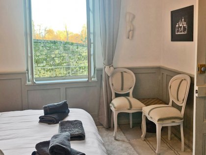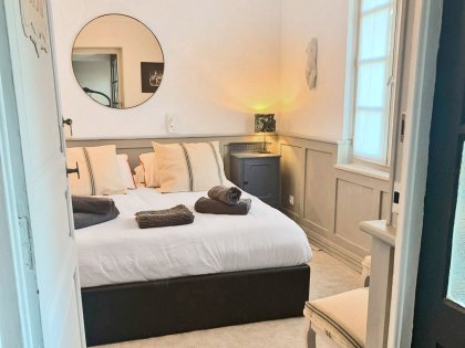 Dieses stilvolle Zimmer ist ideal für Personen mit eingeschränkter Mobilität. Es befindet sich im Erdgeschoss gegenüber dem Esszimmer und dem Salon und verfügt über ein großes Bett (160 cm) und ein modernes Bad. Tee- und Kaffeezubehör.