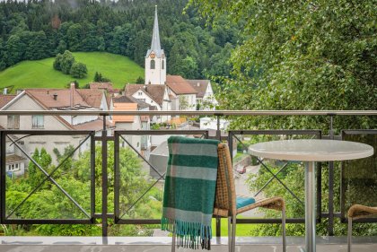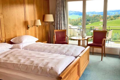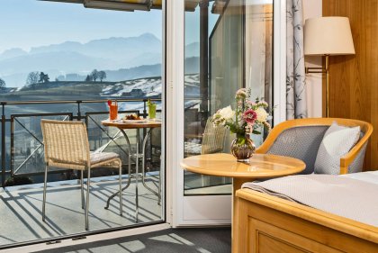 Jedes Zimmer verfügt über einen eigenen grosszügigen Balkon und zeichnet sich durch seinen einzigartigen Ausblick aus. Doppelzimmer zur Alleinbenutzung sind mit Talblick bereits ab CHF 140.- erhältlich, wer noch ein bisschen mehr Platz wünscht, bucht die Junior Suite ab CHF 180 bei Alleinbenutzung und CHF 240.- für zwei Personen, inklusive Frühstücksbuffet.