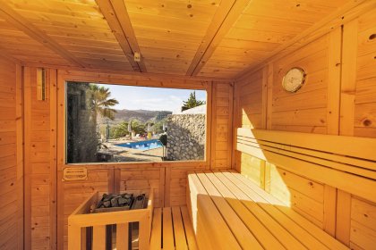 Unsere Finca bietet Ihnen auch eine solarbetriebene Sauna, von der aus sie einen großartigen Blick in die Landschaft haben. Zusätzlich können Sie Beauty-Anwendungen oder Massagen wahrnehmen, die Sie ganzheitlich entspannen werden. Dafür stehen Ihnen ein schöner Behandlungsraum oder der Massage-Pavillon im mediterranen Garten an einer geschützten Stelle zur Verfügung.