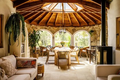 Auf dem großen, teilweise naturbelassenem Grundstück mit riesigen Eukalyptus-Bäumen finden sich viele gemütliche Plätze, um die Seele baumeln zu lassen. Und natürlich gibt es einen großen Pool zum Erfrischen.