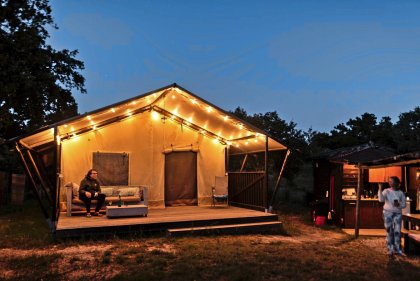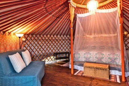 Wir haben jetzt ein südafrikanisches Safarizelt, zwei mongolische Jurten und ein Familienzelt, unser Lodge-Zelt. Alle Zelte verfügen über ein eigenes Bad mit Dusche mit fließend warmem und kaltem Wasser, eine normale Toilette und ein Waschbecken. Handtücher und umweltfreundliche Toilettenartikel werden gestellt.