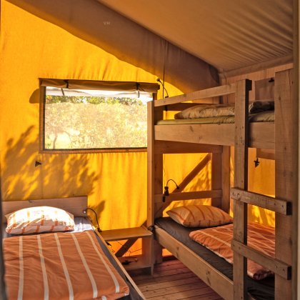 Im Zelt findet ihr ein bequemes Doppelbett, eine Couch und einen Esstisch. Dieser wird kaum benutzt, da ihr meistens den Tisch draußen benutzen werdet!