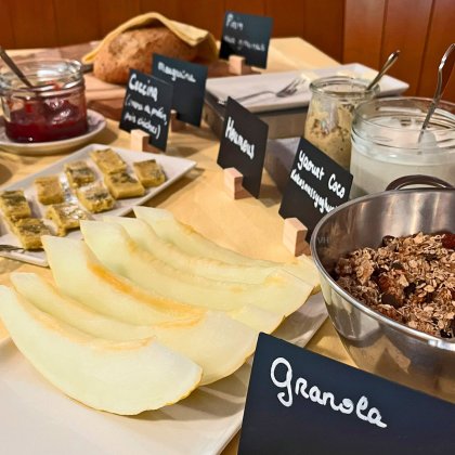 Ein Frühstücksbuffet voller Frische und Vitamine lockt die Gäste bereits früh am Morgen aus dem Bett. Natürlich ist alles bio und besteht aus veganen und glutenfreien Optionen. Wer mittags lieber etwas Leichtes essen möchte, kann sich auf leckere Salate aus der Region oder eine saisonale Suppe freuen. Im Hauptgang wird eine feine Auswahl an verschiedenen Gerichten serviert – traditionell, exotisch, vegan und in jedem Fall raffiniert. Süße Verlockungen in Form von veganen Kuchen und Desserts runden das Angebot ab.