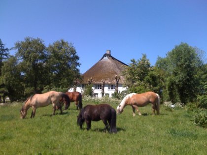 Am Haus gibt es einen großen Garten mit alten Obstbäumen und Liegewiesen, eine sonnige Terrasse direkt vorm Haus, ein Teichbiotop und einen Feuerplatz sowie Hühner, Katzen, einen friedlichen Hund, vier Ponies und ein Pferd. Zur Entspannung steht für unsere Gäste eine urige Fass-Sauna direkt am Teich bereit.